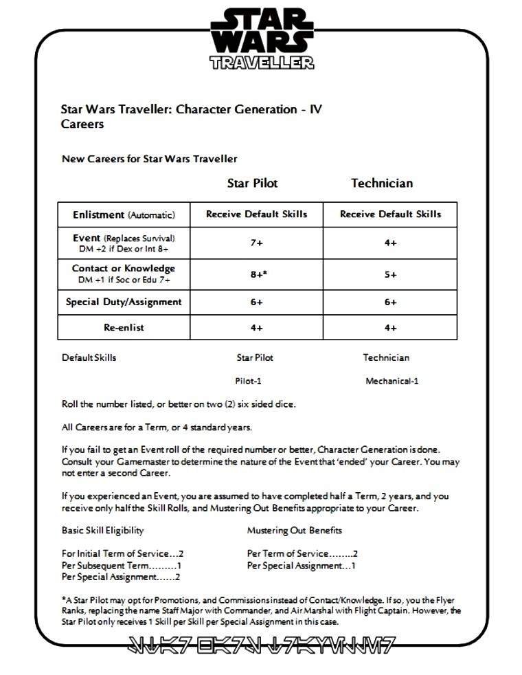 Here are the basic tables for the new Careers I'm adding to Star Wars Traveller. Keep in mind that most of the standard core Careers of classic Traveller/MegaTraveller remain, largely unchanged (see previous post). A few have name changes, but that's it.
